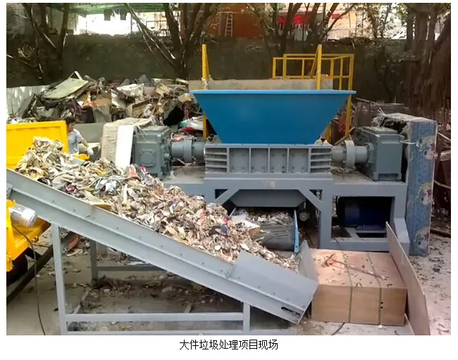 大件垃圾经过破碎机整体破碎之后,物料通过皮带输送机输出,在皮带末端直接进入运料车车斗,然后进行热解炭化处置,产生可回收利用的焦炭、焦油及可燃气。