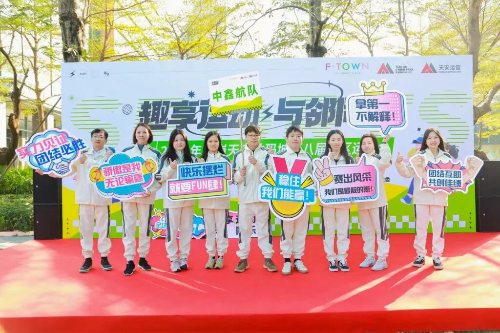 在阳光明媚的活动现场,中鑫航队精神饱满、整装集结,以昂扬的姿态参与园区趣味运动会。团队成员身着统一服装,手举创意标语牌,在欢声笑语中展现出青春活力与团队风采。