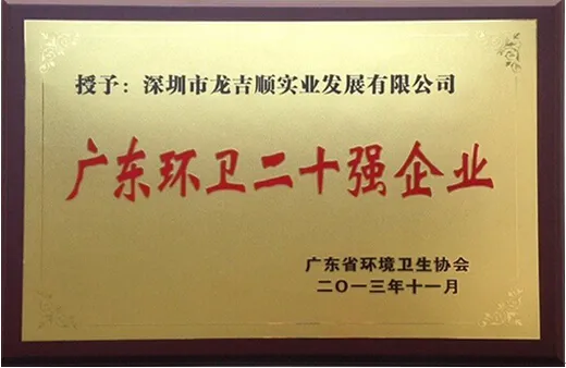公司荣获“广东环卫二十强企业”荣誉称号 2014-12-04 | 集团新闻 广东省环境卫生协会按照《广东省住房和城乡建设厅关于做好第二十个环卫工人节活动的通知》(粤建城函[2013]1169号)的统一部署,组织开展广东省城市生活垃圾处理“优秀示范项目”、“优秀项目”和“广东环卫二十强企业”评选活动。