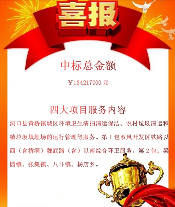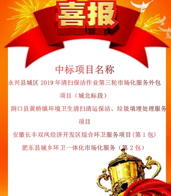 八月份,龙吉顺公司迎来“大四喜”。成功中标永兴县城区2019年清扫保洁作业第三轮市场化服务外包项目(城北标段)、洞口县黄桥镇环境卫生清扫清运保洁、垃圾填埋处理服务项目、安徽长丰双凤经济开发区综合环卫服务项目(第1包)、肥东县城乡环卫一体化市场化服务(第2包)项目,公司又一次实现了质的飞跃。