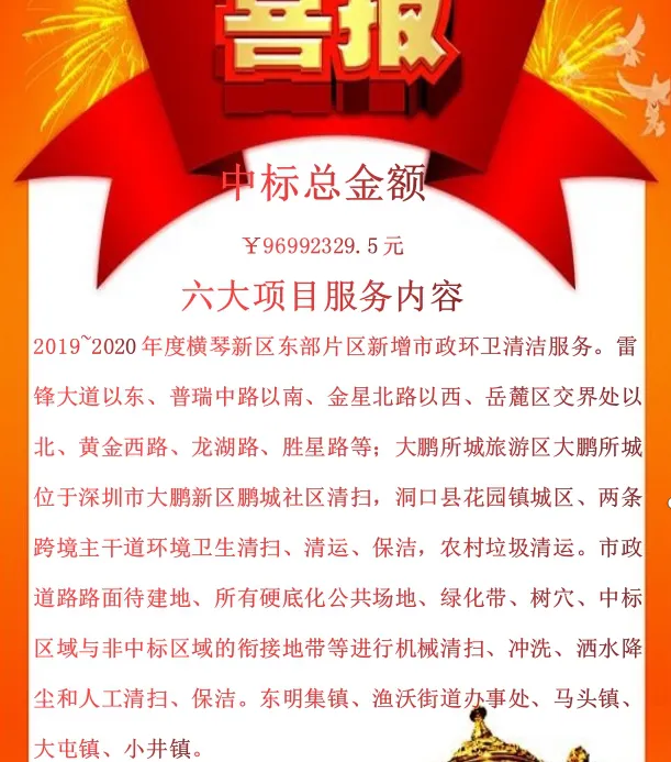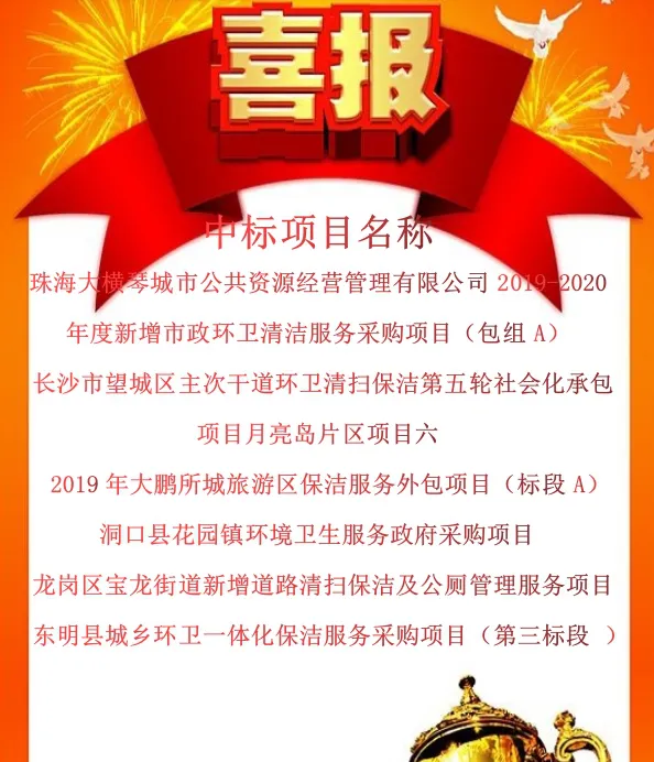 9月份,龙吉顺公司捷报频传,再创辉煌。我公司凭借突出的业绩、雄厚的技术实力以及良好的市场信誉,在众多竞争对手中脱颖而出,连续中标珠海大横琴城市公共资源经营管理有限公司2019-2020年度新增市政环卫清洁服务采购项目(包组A)、长沙市望城区主次干道环卫清扫保洁第五轮社会化承包项目月亮岛片区项目六、2019年大鹏所城旅游区保洁服务外包项目(标段A)、洞口县花园镇环境卫生服务政府采购项目、龙岗区宝龙街道新增道路清扫保洁及公厕管理服务项目、东明县城乡环卫一体化保洁服务采购项目(第三标段 )