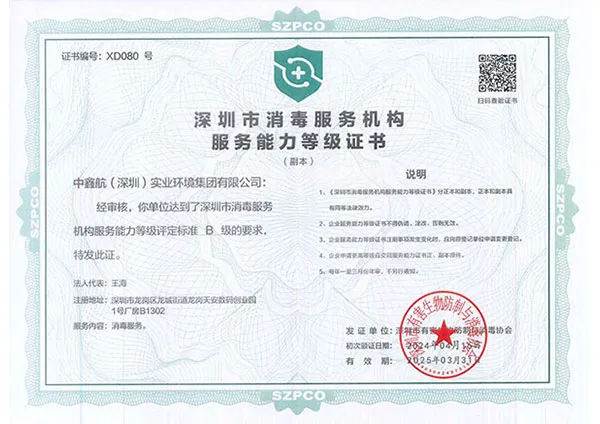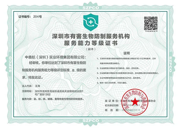 深圳市病媒生物防治服务机构服务能力证书B级(电子证书)