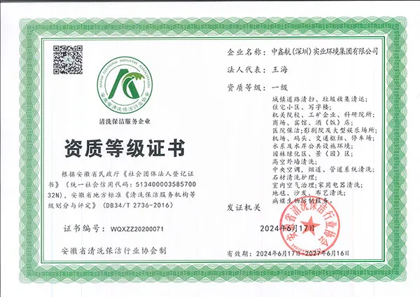 安徽省清洗保洁服务企业资质一级证书(正面)